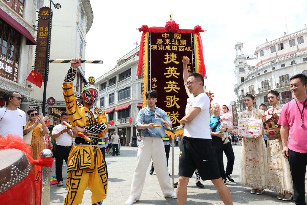 张朝阳的潮汕文化之旅从汕头历史文化地标“小公园”开启。中山纪念亭旁,一支英歌队上演气势磅礴的表演,源自《水浒传》的刚劲舞姿吸引了张朝阳的目光。他全程沉浸观看,还向队员学习转槌动作,亲身体验这一非遗项目的豪迈活力。