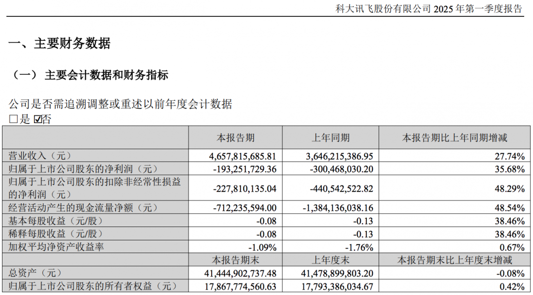 科大讯飞在深交所发布2025年第一季度财报,报告期内,科大讯飞实现营收46.58亿元,同比增长27.74%;净利润亏损1.93亿元,扣除非经常性损益后的净亏损为2.28亿元,同比减亏。