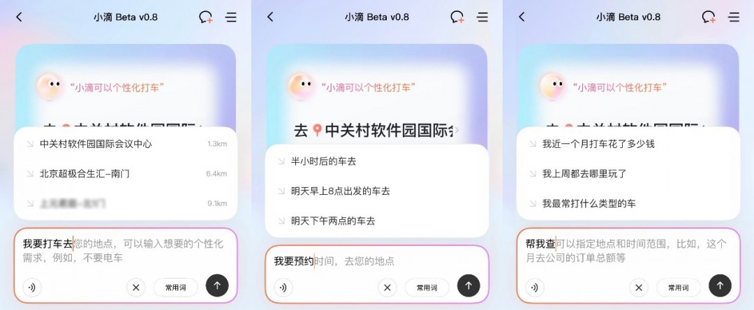 【TechWeb】9月26日消息,滴滴开启公测AI出行助手“小滴Beta v0.8版本”,该功能在滴滴派单系统上,通过智能理解用户需求,为用户提供定制化的用车方案。