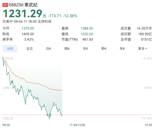 【TechWeb】9月4日消息,今日开盘寒武纪股价1375元,随后进入下跌,截至发稿,跌12.36%,报1231.29元。