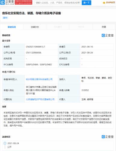 【TechWeb】企查查APP显示,8月24日,杭州网易云音乐科技有限公司公开“音乐社交实现方法、装置、存储介质及电子设备”专利,公开号为CN113296669A。