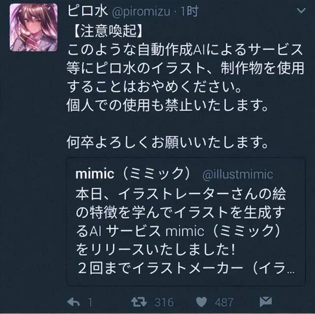 其一,大量画师宣布抵制AI。今年8月29日,一个名叫mimic的AI绘画网站上线了测试版,允许用户上传15至100张图像让AI进行学习,然后输出相同画风的AI画作。然而一些未经授权的画作也被上传学习,把AI生成的画作当做自己的创作进行售卖。随后又出现了有人将刚刚去世的画家尚在版权保护期间的作品上传给AI学习,这些动作相继引发了大批原创作者的不满,从而抵制“AI学习”。