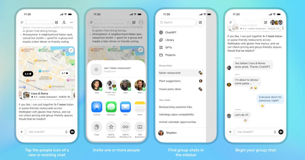 OpenAI将此功能定位为与朋友、家人或同事协作的方式,用于组织聚餐、制定旅行计划和起草大纲等事务——所有这些都由ChatGPT参与。