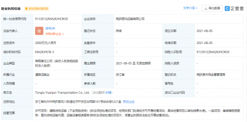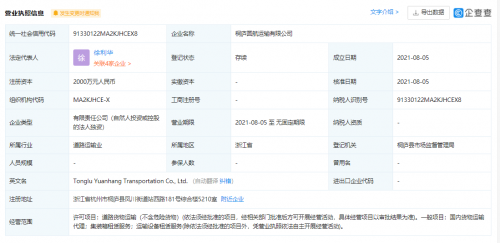 【TechWeb】企查查APP显示,8月5日,桐庐圆航运输有限公司,桐庐圆均运输有限公司成立,法定代表人同为徐利华,注册资本均为2000万元人民币,经营范围皆包括道路货物运输;集装箱租赁服务;国内货物运输代理;运输设备租赁服务。