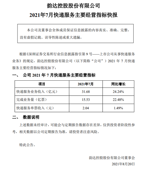 8月20日上午消息,韵达控股发布2021年7月快递服务主要经营指标快报。