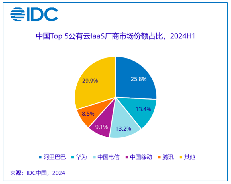 2024年上半年IaaS市场,阿里巴巴、华为、中国电信、中国移动和腾讯为市场排名前五,市场份额总和为70.1%,集中度同比下降2.3%。国际背景云厂商和算力服务云服务商在AI快速发展的前提下,其市场份额提升较快,是市场前五集中度下降的主要原因。