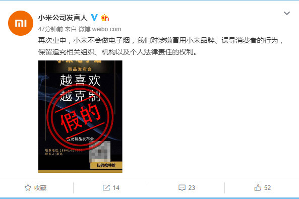 针对此事,小米公司再次在微博上辟谣,称“再次重申,小米不会做电子烟,我们对涉嫌冒用小米品牌、误导消费者的行为,保留追究相关组织、机构以及个人法律责任的权利。”