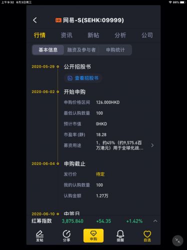 【TechWeb】6月3日消息,网易(09999-HK)首日招股获多家券商合共借出逾272亿港元融资额,相当于公开发售超购41倍,而国际配售据悉也获超购。