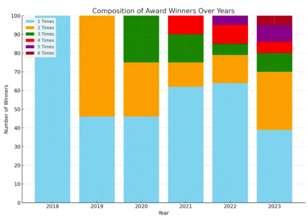 今年首次评上百大的只有 39 位,是历年以来新人比例最低的一次,有不少得了多次百大的 up 再次上榜。