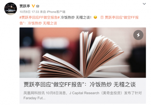 贾跃亭在个人朋友圈表示,该做空机构言论是“冷饭热炒,无稽之谈”,并称J Capital Research已经不是第一次被打脸了,还相约2022年7月加州汉福德新物种诞生日见。