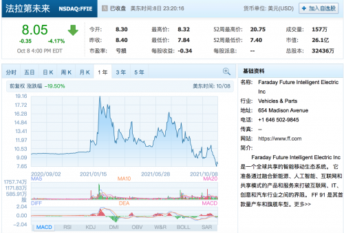 不过,这番言论似乎并没有打消资本市场的疑虑。截至10月8日收盘,FF股价下跌4.17%,报8.05美元,相较发行价13.78美元,已经跌去41.58%,若从上市首日盘中最高的17美元/股计算,其股价已经腰斩。