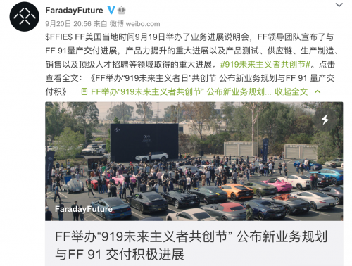 今年9月,在FF“919未来主义者日”上,FF全球CEO毕福康宣布了FF 91量产交付的进展,称“我们有充足的信心在上市后12月内按时高质量、高产品力交付FF 91Futurist。”