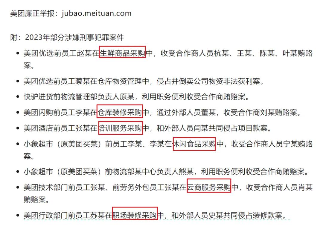 再比如美团,2023年美团协助公安立案侦办了93起涉嫌犯罪的内外部人员案件。其中7个案件的舞弊贪腐行为发生在生鲜商品、休闲食品、仓库装修等采购环节,涉及美团优选、小象超市、美团闪购、美团酒店等多个业务部门。