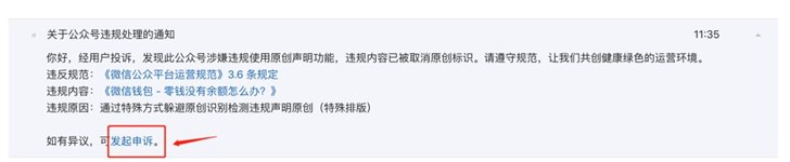 在公众号后台违规通知,通过“发起申诉”提交授权证明材料,即可进行申诉。
