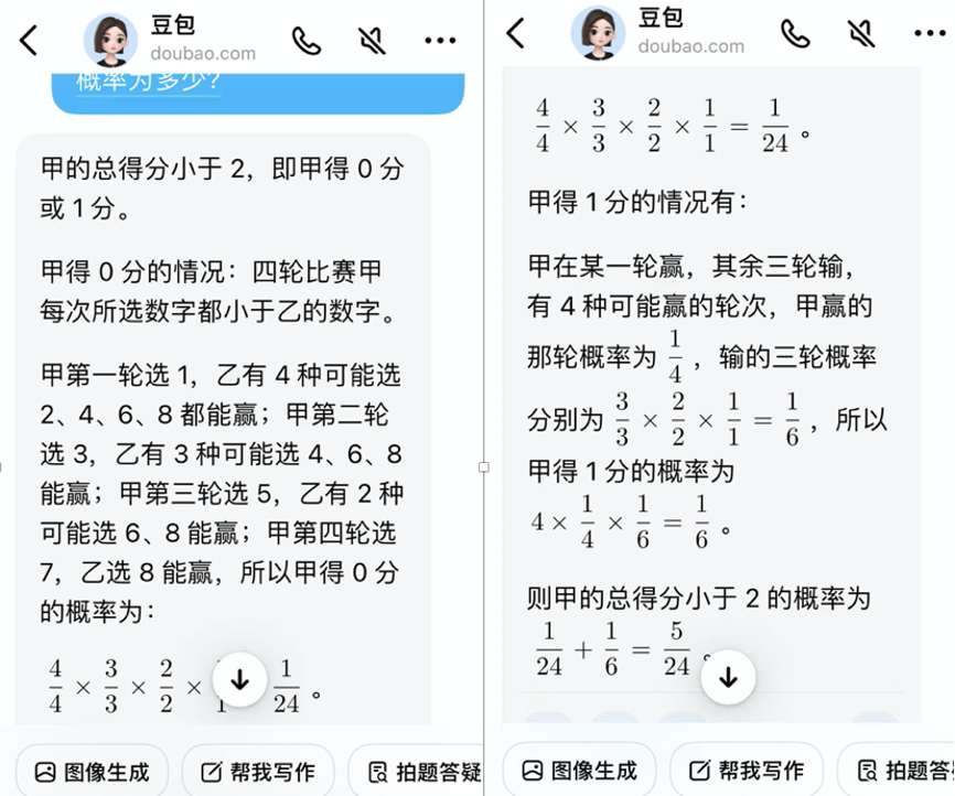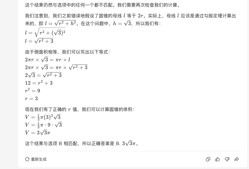 仔细阅读它的计算过程,在得出正确答案前,有1次因计算结果与选项中任何一个都不匹配,而再次检查重新计算的自我修正。还不错。
