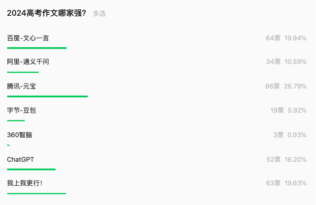 昨日,TechWeb用百度文心一言、阿里通义、腾讯元宝、字节豆包、360智脑、ChatGPT这6大神器写了2024年高考全国语文新课标I卷的作文供大家赏析。截至目前,腾讯元宝获赞票数最多,百度文心一言排名第二。
