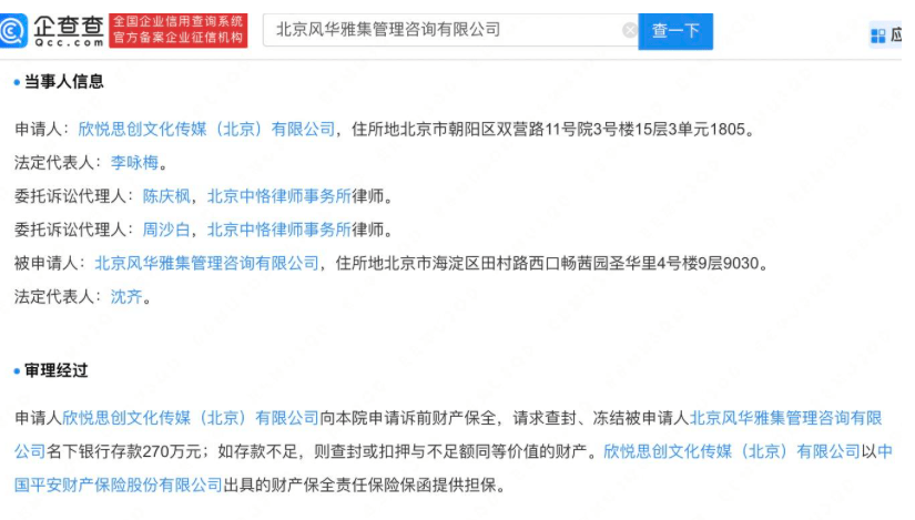 近日,北京风华雅集管理咨询有限公司相关诉前财产保全裁定书公开。文书显示,欣悦思创文化传媒(北京)有限公司向法院申请诉前财产保全,请求查封、冻结被申请人北京风华雅集管理咨询有限公司存款270万元;如存款不足,则查封或扣押与不足额同等价值的财产。法院认为该申请符合法律规定,裁定执行。企查查信息显示,北京风华雅集管理咨询有限公司成立于2015年,主持人杨澜持有该公司95%股份。