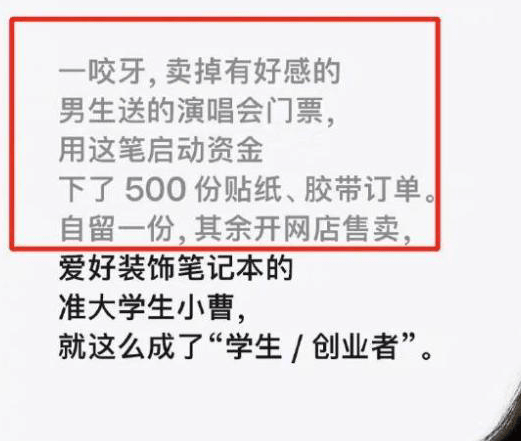 文案提到,“一咬牙,卖掉有好感的男生送的演唱会门票,用这笔启动资金下了500份贴纸、胶带订单,自留一份,其余开网店售卖”。