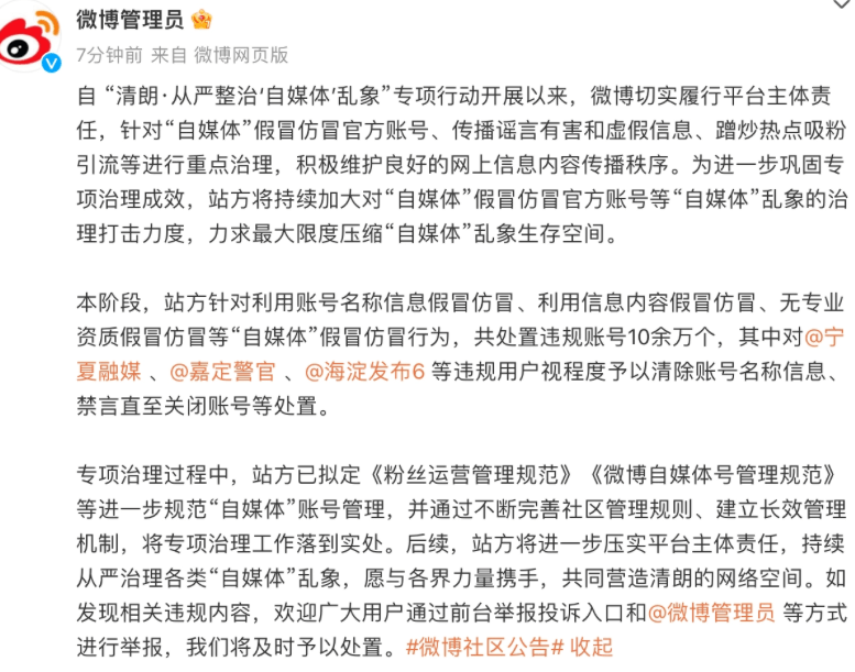 微博表示,本阶段,站方针对利用账号名称信息假冒仿冒、利用信息内容假冒仿冒、无专业资质假冒仿冒等“自媒体”假冒仿冒行为,共处置违规账号 10 余万个。