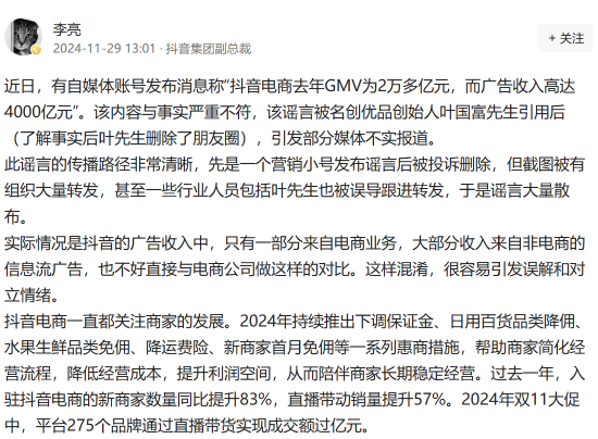 抖音电商去年广告收入4000亿元?集团副总裁李亮发文回应快讯