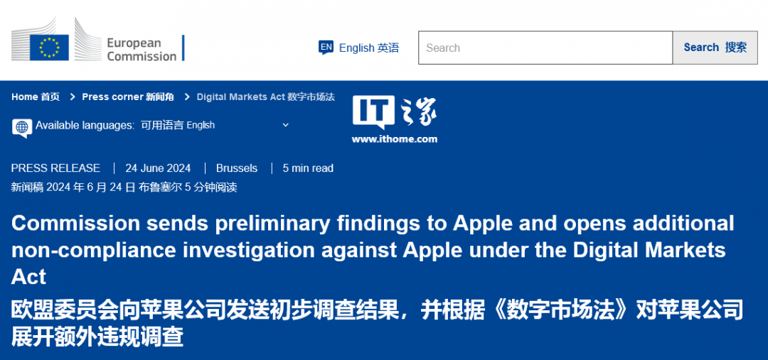 6 月 25 日消息,欧盟于昨日(6 月 24 日)发布初步裁决公告,认定苹果欧洲新规违反了《数字市场法案》,将于 2025 年 3 月做出最终裁决。