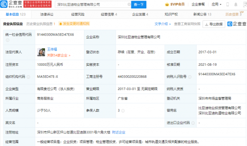 企查查信息显示,该公司成立于2017年,注册资本1亿元人民币,经营范围包含:企业投资;项目管理;物业管理投资等,由深圳市比亚迪投资管理有限公司100%控股。